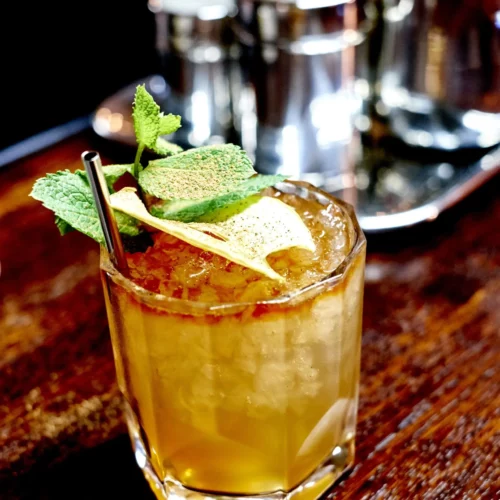 - Préparez le cocktail directement dans le verre : Versez le Spiced Rum, le dry sherry, le pommeau de normandie et le jus de pomme, ajoutez le cidre refroidi et quelques glaçons. Melangez énergiquement 1min et complétez de glace pilée.